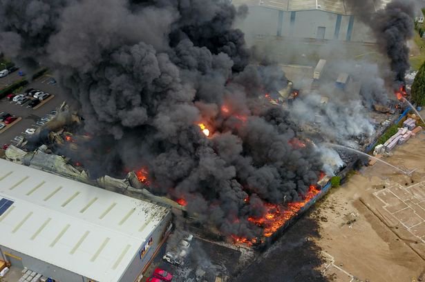 This is an industrial premise approximately 50m x 30m and well alight. A large fire at an industrial premises on juno road in leamington spa has led emergency services to evacuate the surrounding area, warwickshire police have confirmed. Residents urged not to touch black plastic that rained down from sky. Dramatic footage on social media. Smoke is spreading fast across leamington spa from a blaze. Huge plume of smoke rises from leamington spa fire. Workers watch as smoke pours from 'warehouse' evacuations are taking. Helicopters circling and hearing explosions now. A spokesman for warwickshire fire and rescue service said: We received a call to a significant fire on juno drive in leamington spa at 10.38am. The fire was at a nearby timber yard. This is an industrial premise approximately 50m x 30m and well alight. Photos and video shared online show a.